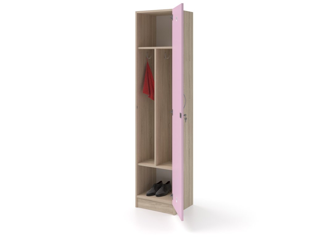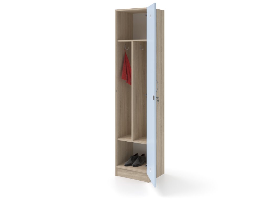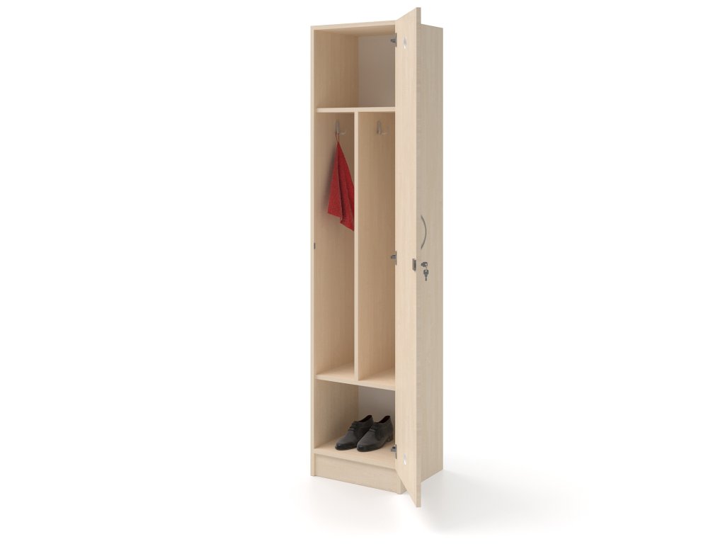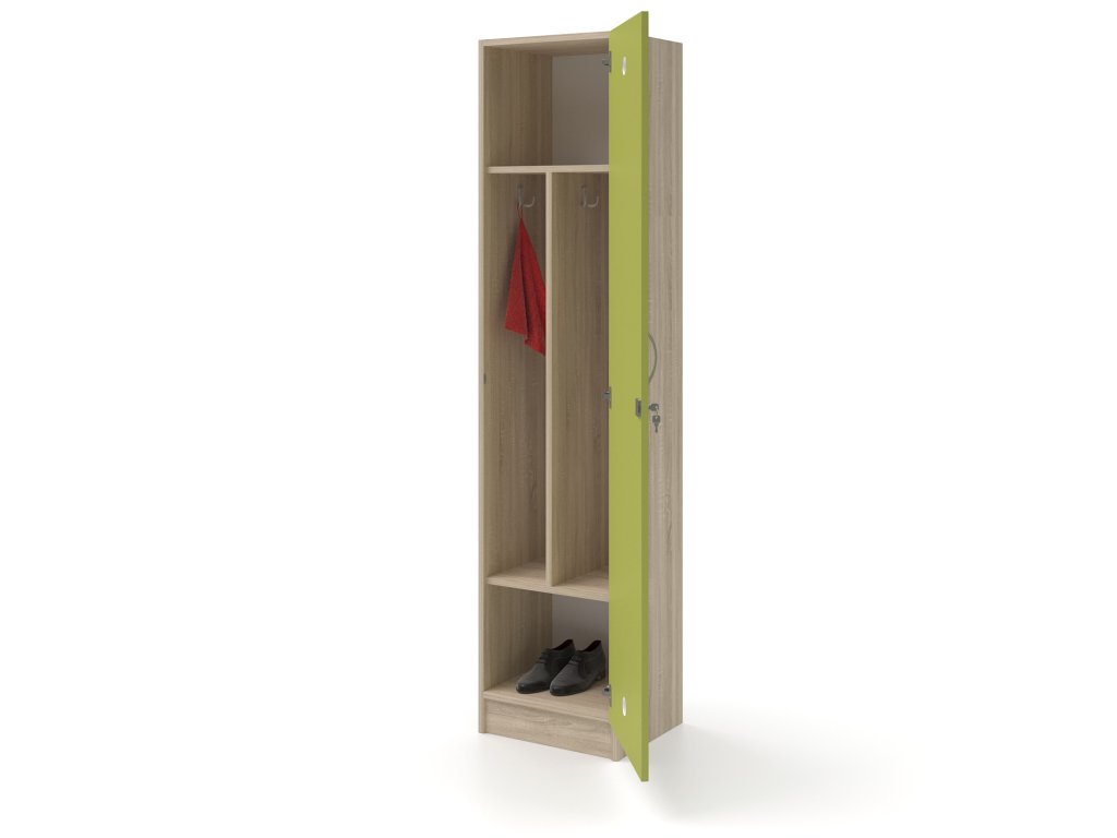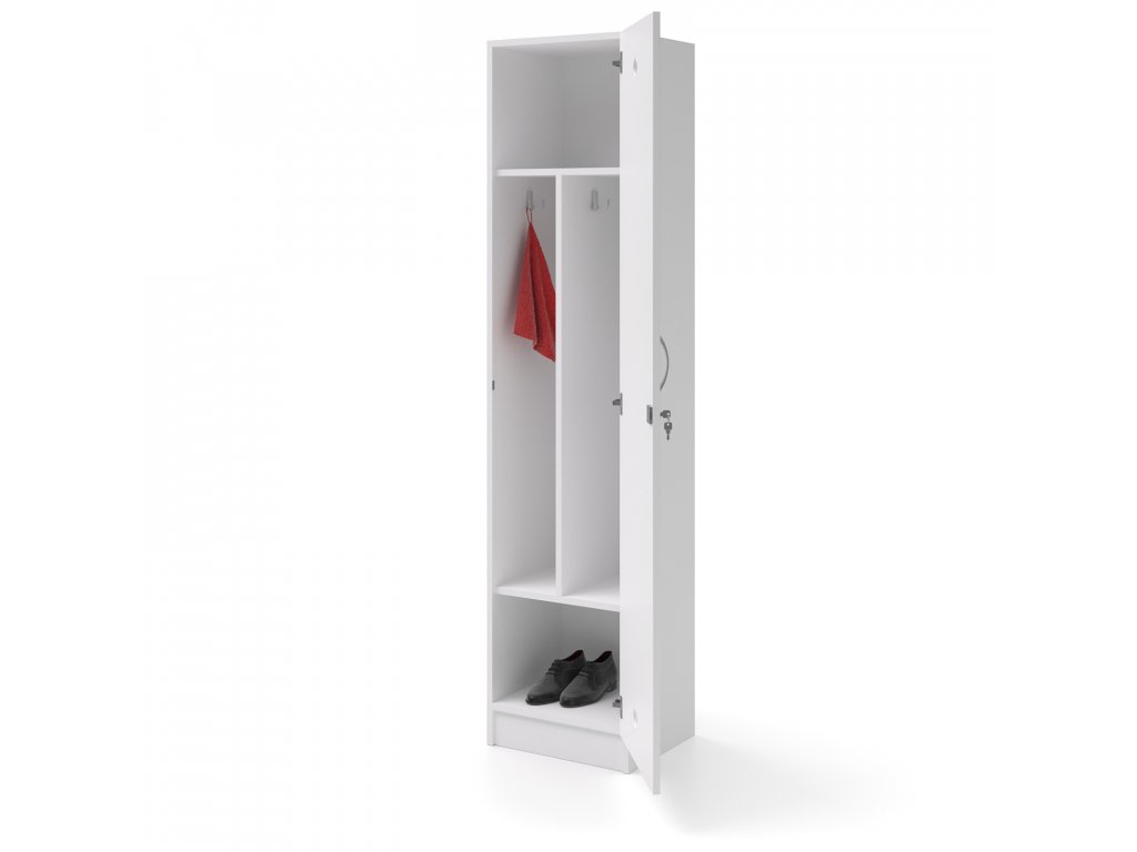 Lékařská skříň vysoká 1-dveřová šatní, 2 šatní oddíly (pravá orientace) šíře 40 cm - 50 cm (L-SK-54X-14-P), sololitová záda, 2 šatní oddíly, 2 pevné police, 1 svislá příčka, 2 2-háčky, 1 oddíl pro obuv, 1 dveře, zámek, sokl, 1 kovová úchytka, rektifikační patky pro případné vyrovnání nerovnosti podlahy, rozměry ŠxVxH 40 cm - 50 cm x 195 cm x 40 cm