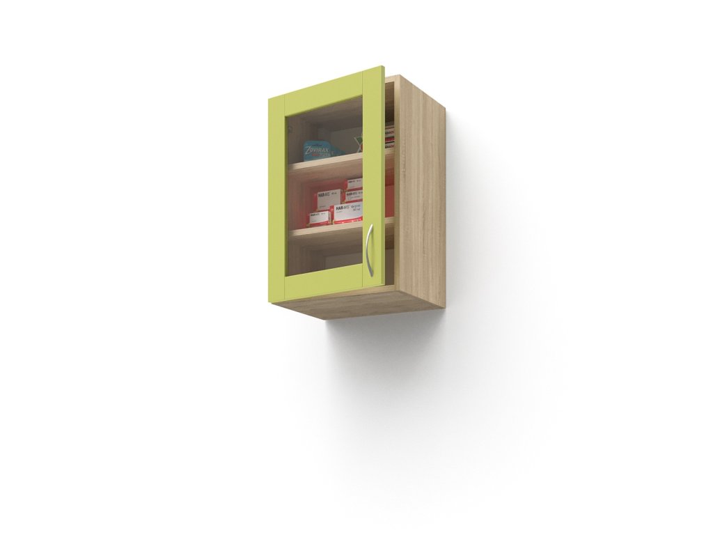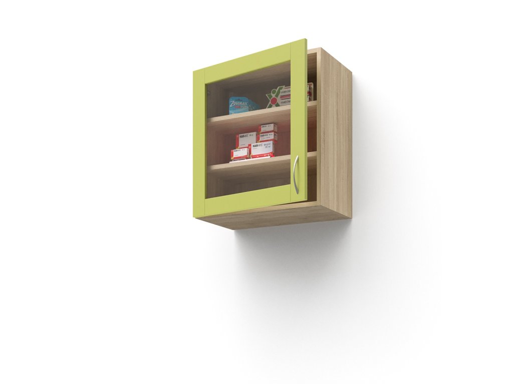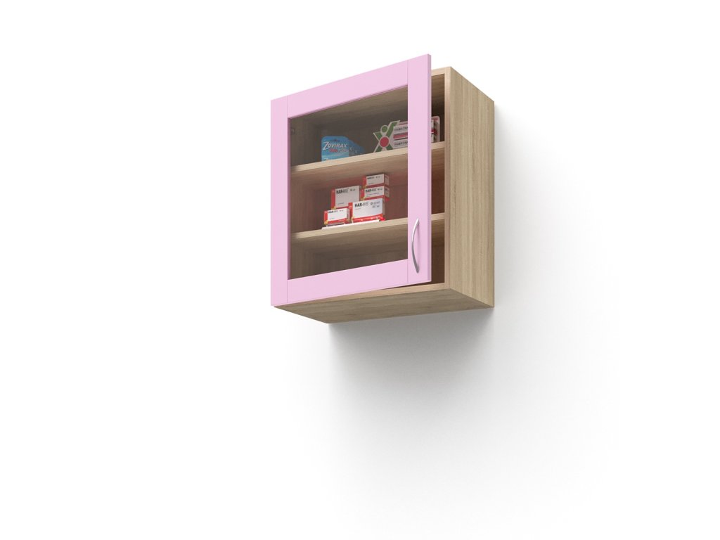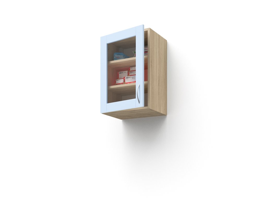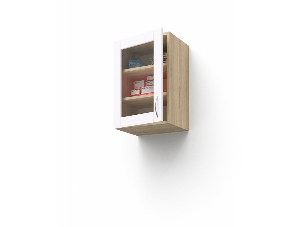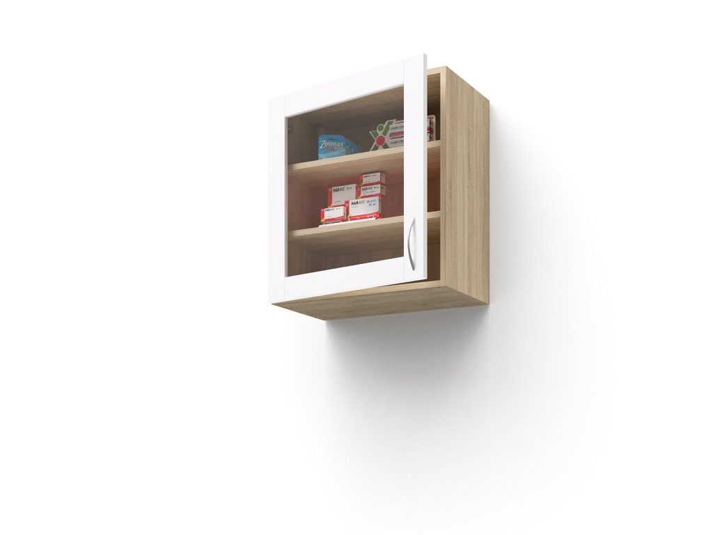 Lékařská skříň horní závěsná 1-dveřová prosklená v rámu levá šíře 45 cm - 60 cm (L-SKZ-2xx-04-RAM-L), sololitová záda, 2 stavitelné police, 1 prosklené dveře v rámu, kuchyňské závěsy včetně protiplechů, kovová úchytka, rozměry ŠxVxH 45 cm x 64 cm x 35 cm