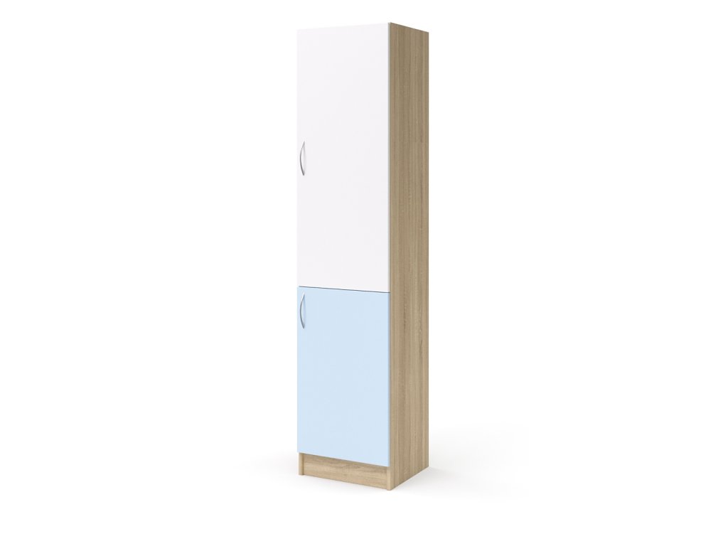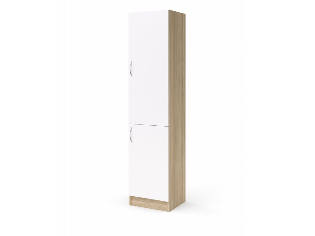 skříň vysoká 2-dveřová pravá, šíře 40 cm - 45 cm (L-SK-540-02-P), sololitová záda, 2 stavitelné police, 2 pevné police, 2 dveře, 2 kovové úchytka, sokl, rektifikační patky pro případné vyrovnání nerovnosti podlahy. korpus vyroben z 18 mm LTD s možností volby barevného provedení, rozměry ŠxVxH 40 cm - 45 cm x 195 cm x 40 cm